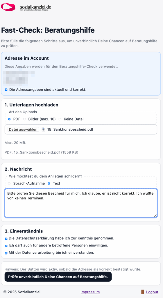 Du schickst uns z.B. einen Bescheid und sagst uns per Sprachnachricht, was das Problem damit ist. Innerhalb von wenigen Stunden (Mo. – Fr. 8:30 Uhr – 14:00 Uhr) sagen wir Dir, ob sich der Beratungshilfe-Antrag lohnt.
